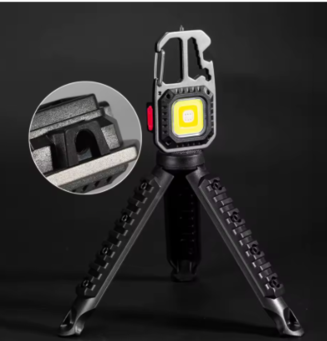 Handige zaklamp met sleutelhanger, statief en houder. Ideaal als noodlamp voor kamperen, wandelen, vissen en andere buitenactiviteiten. Compact, krachtig en makkelijk mee te nemen.